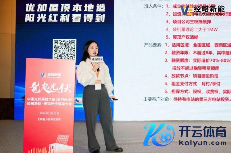金源华兴华南区销售总监巴桂枝发表了题为《工营业散播式光伏电站融资处置决策》的演讲。金源华兴在新动力发电、高端装备、解释等多个界限均有所布局,异常是在新动力界限,提供了包括光伏电站平直租借、光伏电站售后回租、储能的直/回租业务以及供应链融资在内的四种融资处置决策。具有样式融资征信强、无地盘证、产权证可操作、良友简便审批高效、样式承作念范围跨度大等居品上风。2024经略新能·“金旭奖”