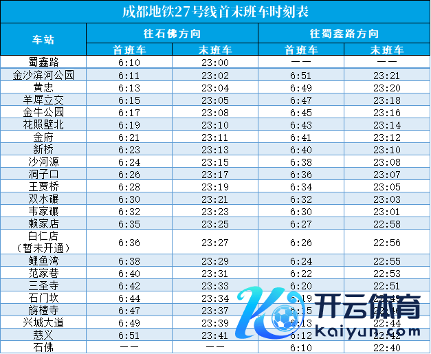 27号线蜀鑫路站首班车时刻为6:10,末班车时刻为23:00,石佛站首班车时刻为06:10,末班车时刻为22:40;袭取蜀鑫路站—石佛站、蜀鑫路站—三圣寺站大小交路1:1驱动,大交路单边(蜀鑫路站—石佛站)驱动时刻约为43分钟,小交路单边(蜀鑫路站—三圣寺站)驱动时刻约为32分钟。