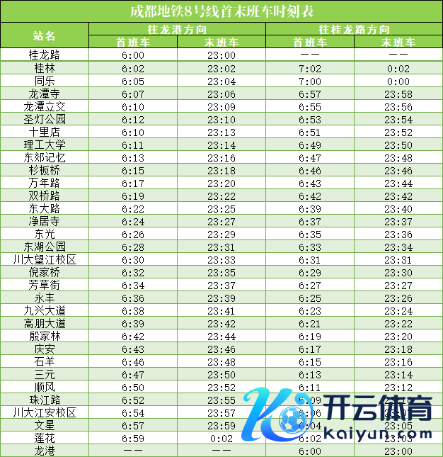 初期运营阶段,8号线桂龙路站、龙港站首班车时刻为6:00,末班车时刻为23:00,单边(桂龙路站-龙港站)驱动时刻约为63分钟。