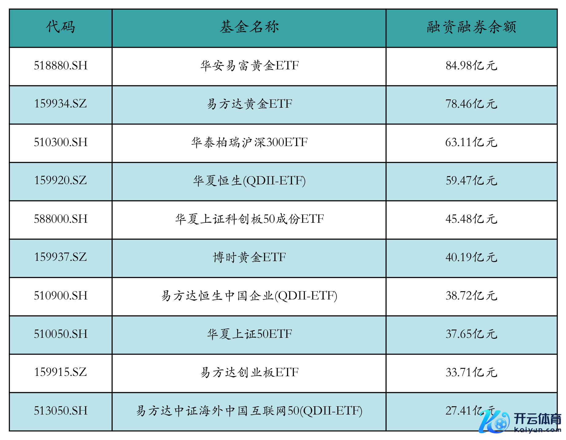12月27日ETF两融余额前三位隔离为:华安易富黄金ETF(84.98亿元)、易方达黄金ETF(78.46亿元)和华泰柏瑞沪深300ETF(63.11亿元),前10具体见下表: