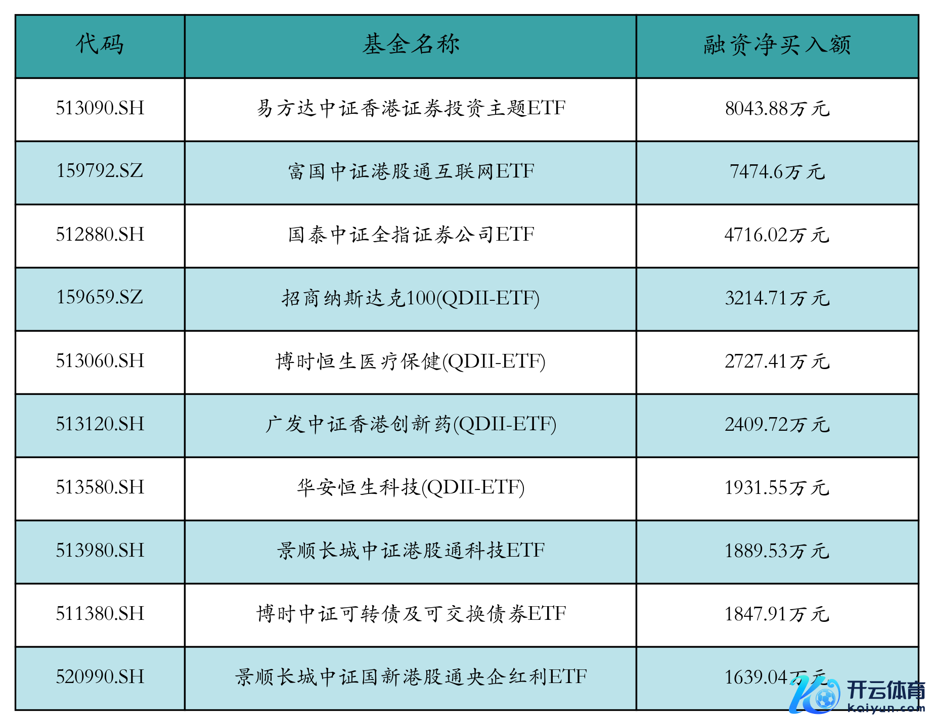 12月27日ETF融资净买入额前三位隔离为:易方达中证香港证券投资主题ETF(8043.88万元)、富国中证港股通互联网ETF(7474.6万元)和国泰中证全指证券公司ETF(4716.02万元),前10具体见下表: