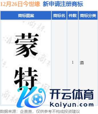 证券之星音问,阐述企查查数据贯通,近日江苏今世缘酒业股份有限公司新提交1件商标注册肯求。商标肯求细目如下: 本年以来江苏今世缘酒业股份有限公司新肯求注册商标0件,规矩现在公司共合手有注册商标1931件,另有184件商标尚在注册肯求中。 以上本体为证券之星据公开信息整理,由智能算法生成(网信算备310104345710301240019号)现金万博manbext网页版登录app平台,不组成投资暴戾。