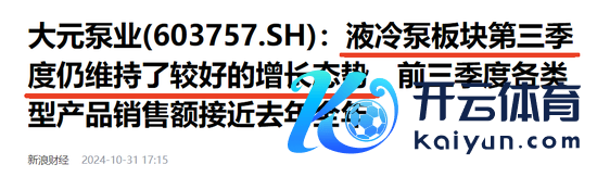 2024年10月31日,大元泵业(603757)在功绩相似电话会议上默示,公司液冷泵板块在2024年第三季度仍督察了较好的增长态势,前三季度万般型居品销售额接近2023年全年。当作新兴的业务板块,液冷泵居品的应用领域广袤,公司各细分垂直领域的客户开拓职责也握住有新的进展,明天跟着IDC、氢能源汽车、储能等新兴行业的握住进修,关联业务仍有望在当今的低基数上督察较好的发展势头。
