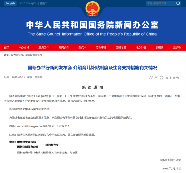 国新办举行新闻发布会 先容育儿补贴轨制及生养赞助挨次相关情况 国务院新闻办公室将于2025年7月30日(星期三)下昼2时举行新闻发布会,请国度卫生健康委副主任郭燕红和财政部、国度医保局、世界总工会相关崇敬东谈主先容育儿补贴轨制及生养赞助挨次相关情况,并答记者问。 国新办网站截图↑ 着手:国新办网站 珍重!万博manbext网页版登录app娱乐