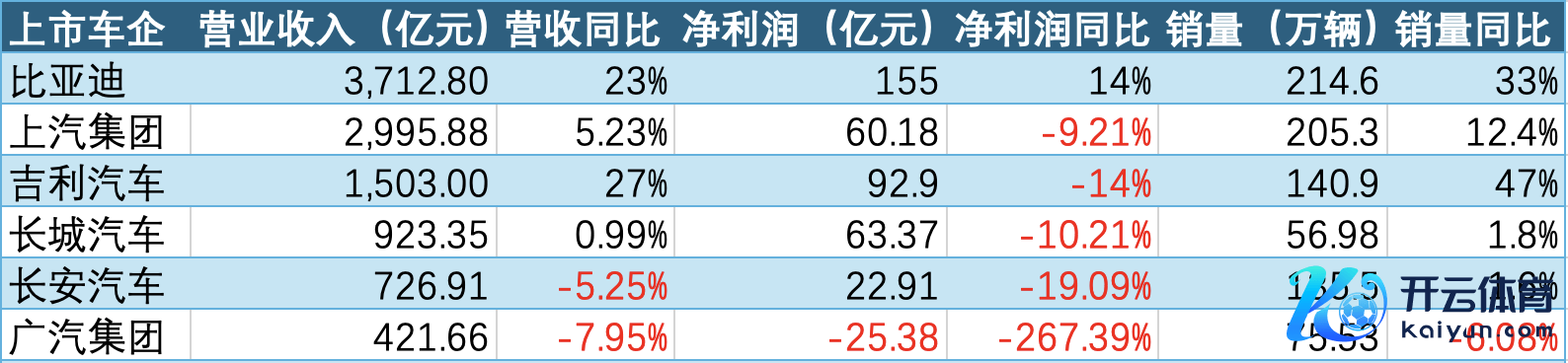 2025年上半年上市车企功绩均已统共公布,比亚迪(002594.SZ;01211.HK)依旧有强大的逾越上风,营收、净利润均位居第一;广汽集团(601238.SH)的各项数据则皆已垫底,且由盈转亏。